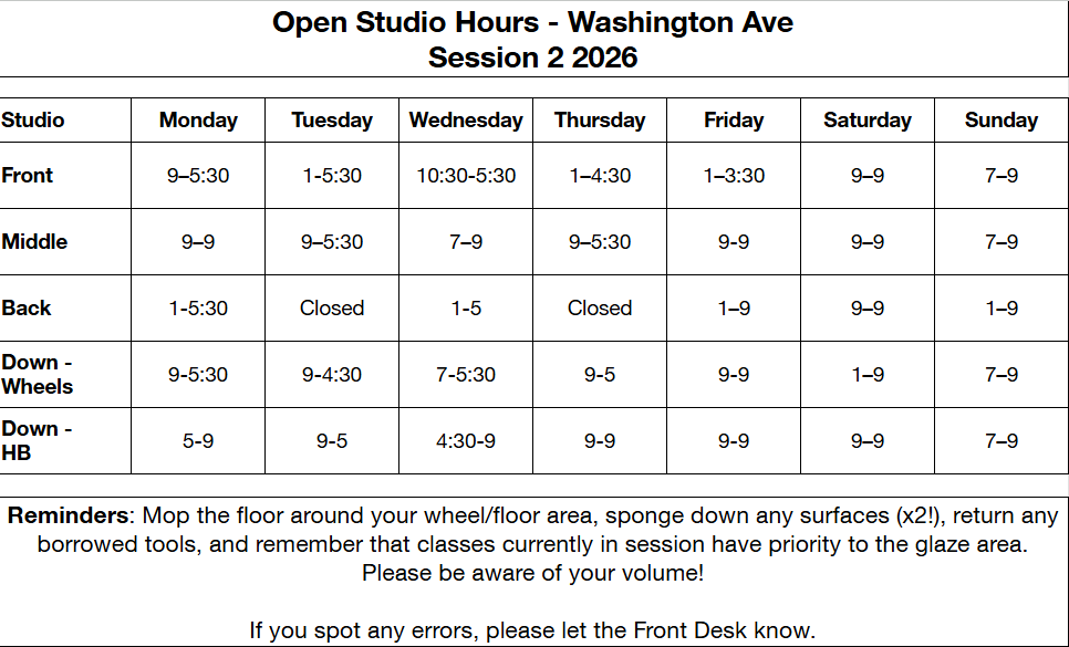 Our classes include a free bag of clay, group and 1-on-1 instruction, weekly demonstrations, critiques of finished pieces, and access to Open Studio Hours (see below). Classes meet for 3 hours each week for eight weeks.