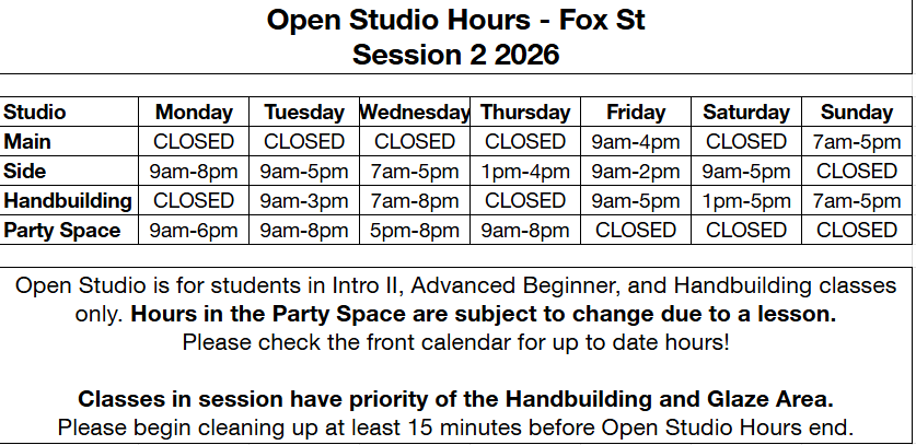 Classes offered at our new 49 Fox Street Studio and use mid-fire clay.